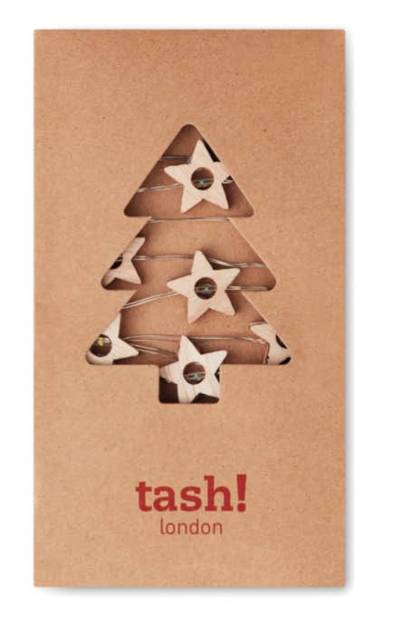 Guirlande avec 20 lampes à LED en forme d'étoile en bois. Présenté dans une boîte en carton. 2 piles AA non incluses. Bouton marche / arrêt dans le compartiment à piles.